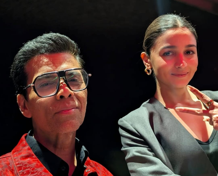 The photo carousel captures Alia Bhatt’s candid moments on set, including images with Vedang Raina and Karan Johar. One behind-the-scenes shot shows the actress getting her makeup done, while others feature her with the cast and crew of the film.