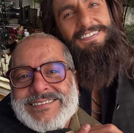 In the picture, Ranveer Singh is seen in his character, sporting a rugged look with long hair and a thick beard, while Gaurav appears in a completely transformed avatar with a grey beard and spectacles, making him almost unrecognisable.