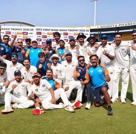 Sharma, after hitting Suraj Sindhu Jaiswal for three boundaries, sealed the win with a six over Mukesh Kumar’s head to trigger jubilant celebrations as the players lifted their coach in a huddle.