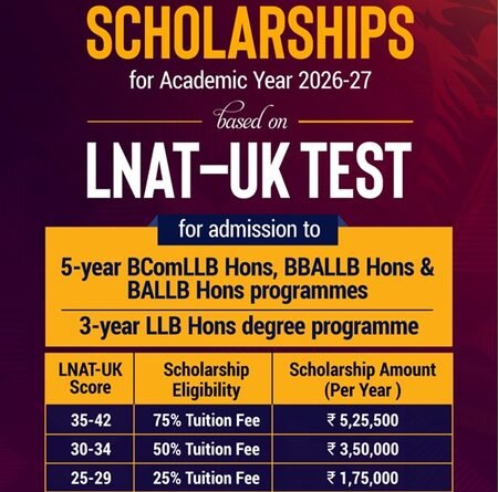 LNAT-UK scores will be considered for merit-cum means-based scholarships. Scholarships are awarded in the range of 10 per cent, 25 per cent, 50 per cent, and 75 per cent of tuition fees, based on merit and annual parental income criteria.