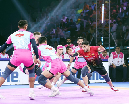 The defence of the Bulls, led by the young Deepak Sankar, who completed his High Five with a tackle on Ali Samadi, complemented the raiders well in what was turning out to be a one-sided match in favour of the Bulls. For the Pink Panthers, Ali Samadi and Vinay Redhu did not get any support from their teammates.