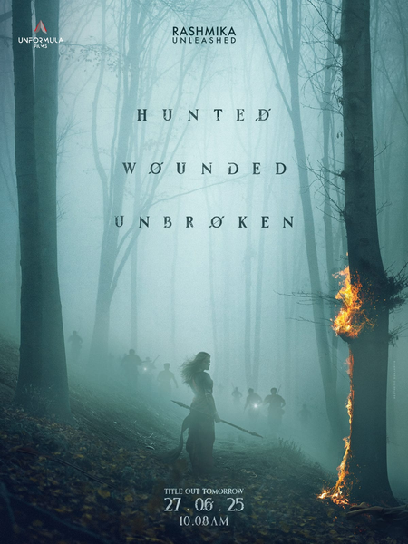 The poster that Rashmika shared had her holding a double-edged spear and standing next to a burning tree. It had the phrase “Hunted, wounded, unbroken” written on it.