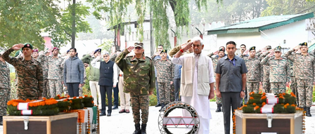 An official statement said that the L-G laid a wreath and paid homage to Army Bravehearts Lance Havildar Palash Ghosh and Lance Naik Sujay Ghosh, who laid down their lives for the nation.